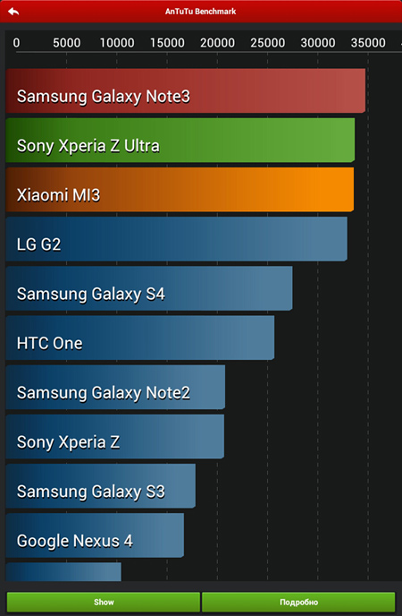 После нескольких тестов выставит таблицу с подробным описанием вашего девайса. Так же показывает ваш телефон в топе смартфонов. Тем самым можно узнать на сколько круче ваш телефон или насколько хуже других | |