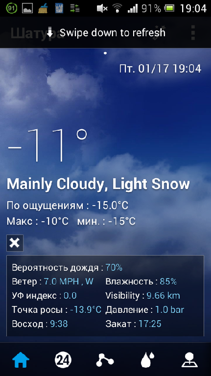 Приложение для погоды! Вы можете вынеси виджит на рабочий стол с погодой в вашем регионе и просматривать погоду на текущую неделю. Очень красивое выполнение визуализации | |